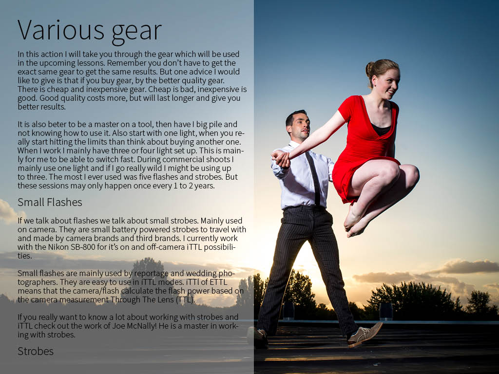 In the first chapters I teach you the five basic variables you need to know for flash photography. The chapters after that will discuss all the basic gear you need and don't need. After that it is practical time! I have added photo's made with all kinds of light modifiers and a description about what I used and the settings.